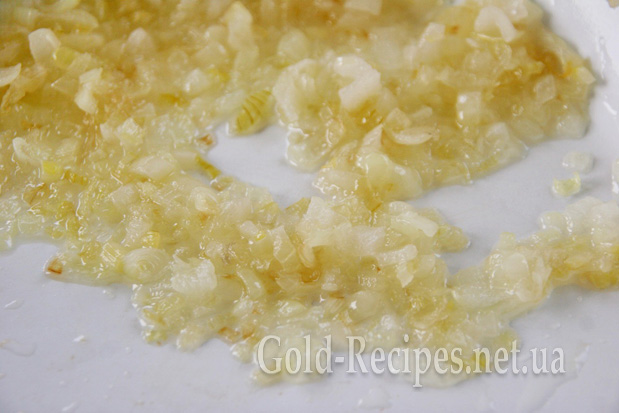 Цибулину чистимо і ріжемо дуже дрібно. На розігрітій олії пасеруємо цибулю до прозорості та легкої золотистості.