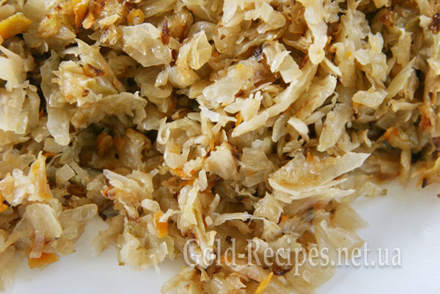 Квашену капусту дрібно рубаємо – на шматочки приблизно до 1 см. Додаємо квашену капусту до цибулі, перемішуємо. Обсмажуємо хвилин 15-20, до готовності капусти. Перекладаємо капусту зі сковорідки в миску або на тарілку і відставляємо охолоджуватися.