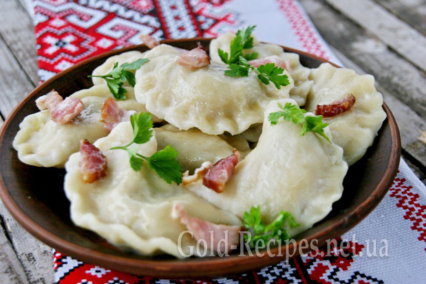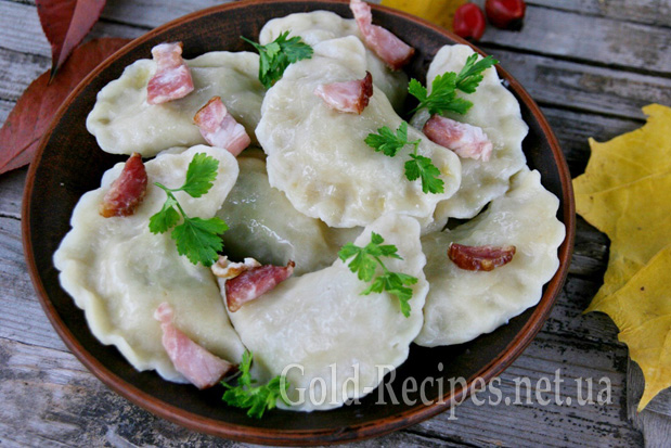 Подаємо вареники гарячими. Можна прикрасити їх просто зеленню, а можна посипати зверху смаженою цибулею, підчеревиною, копченим беконом чи салом.