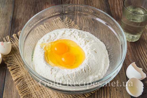 Тепер приготуємо тісто. У глибокий сухий посуд просіємо пшеничне борошно, щоб тісто вийшло ніжнішим. Зробимо з борошна гірку з заглибленням усередині.