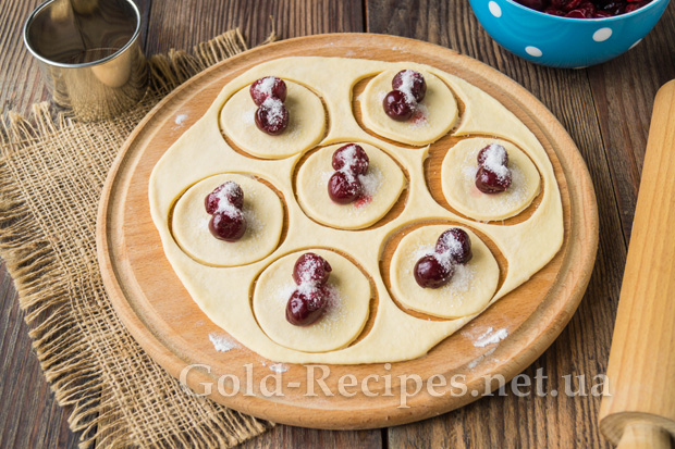 У середину кожної заготовки викладемо по кілька вишень (залежно від розміру ягід і самих заготовок).