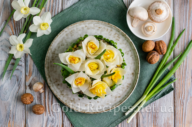 Смачний та неймовірно красивий салат “Нарциси” готовий до вживання. Його можна подавати відразу після приготування або попередньо охолодити у холодильнику.