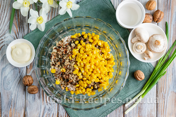 Консервовану кукурудзу проціджуємо від маринаду, додаємо до решти інгредієнтів.