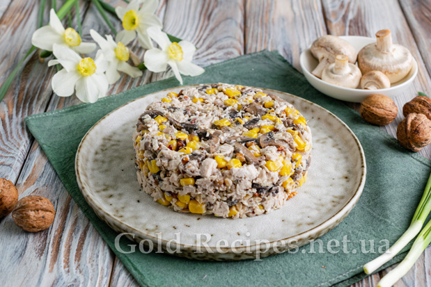 Тепер залишилося лише гарно оформити салат. Викладаємо його на плоску тарілку, злегка утрамбовуючи інгредієнти. Зручно використовувати для цього кулінарне кільце невеликого діаметра.
