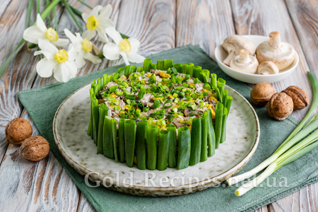 Пір’я зеленої цибулі миємо, нарізаємо на сегменти однакового розміру. Вони повинні бути трохи більше висоти салату. Прикрашаємо пір’ям цибулі готовий салат, як на фото. Зелену цибулю, що залишилася, нарізаємо кільцями, викладаємо зверху.