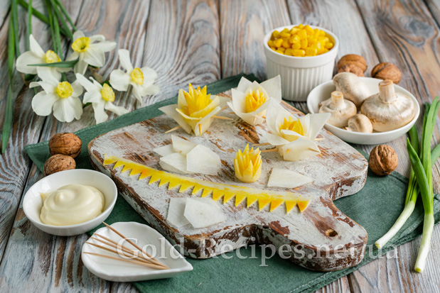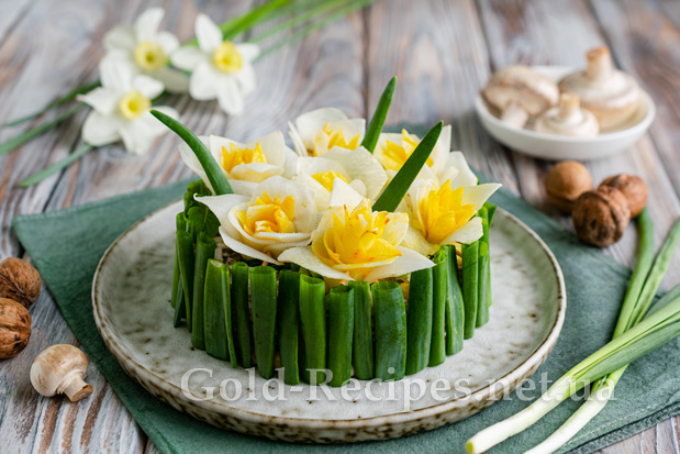 Прикрашаємо салат їстівними квітами. У середину вставляємо кілька пір’я зеленої цибулі, імітуючи листя нарцисів.