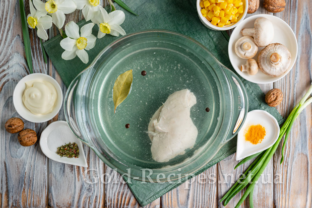 Після закипання води видаляємо піну, додаємо трохи солі, лавровий лист та чорний запашний перець для аромату. Зменшуємо вогонь до мінімуму, варимо куряче філе протягом 20 хвилин. Охолоджуємо м’ясо до кімнатної температури в бульйоні, так воно вийде дуже ніжним.