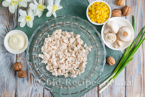 Нарізаємо остигле куряче філе кубиком середнього розміру, викладаємо м’ясо в салатник.