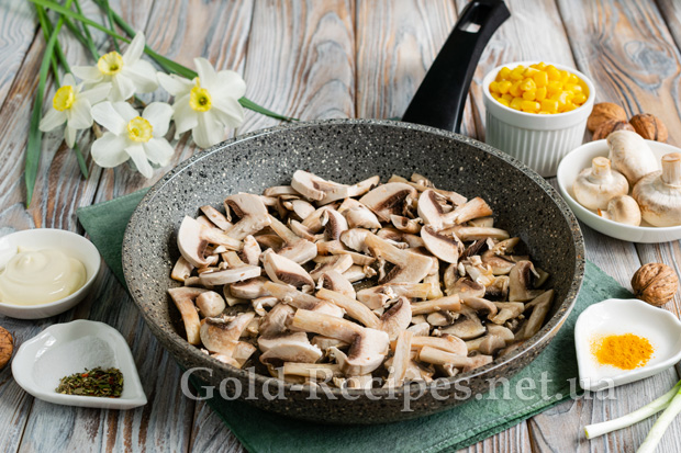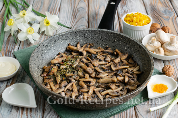 Періодично помішуючи, обсмажуємо печериці на середньому вогні до золотистого відтінку. Наприкінці приготування додаємо сіль та сушені італійські трави. Перемішуємо, остуджуємо гриби до кімнатної температури.