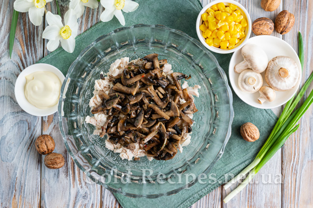 Додаємо смажені печериці до вареного курячого філе.