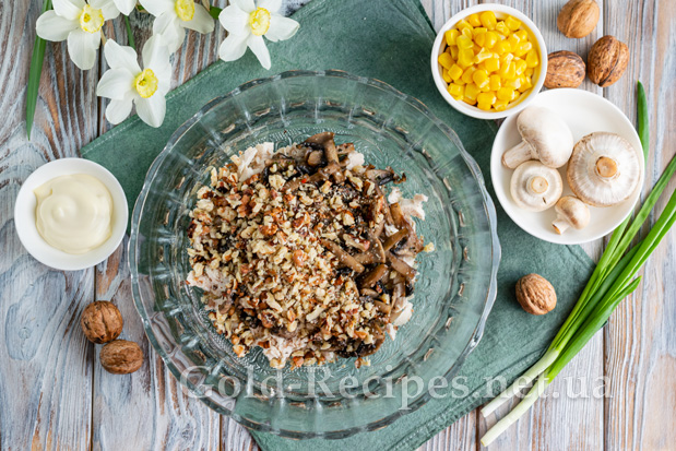 Ядра волоських горіхів подрібнюємо у велику крихту, додаємо в салат. Горіхи можна перебити в крихту в чаші блендера, нарізати ножем або подрібнити за допомогою качалки.