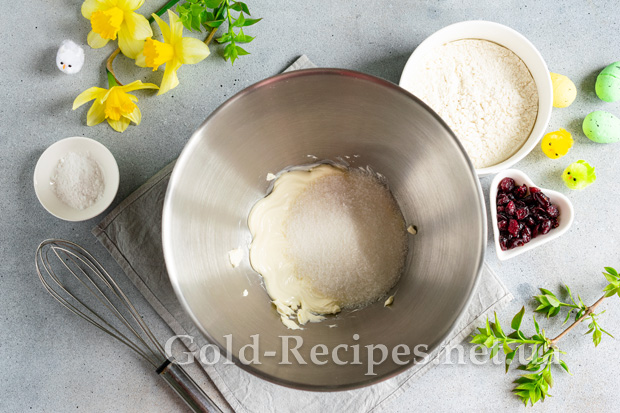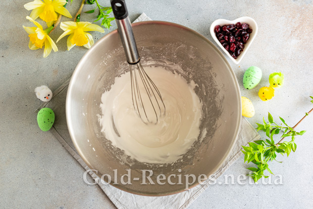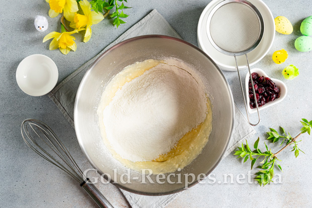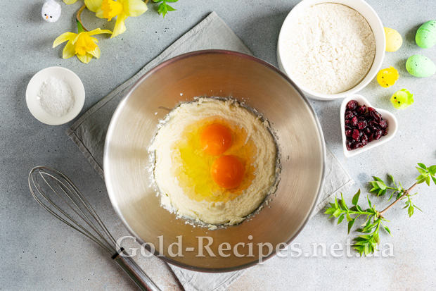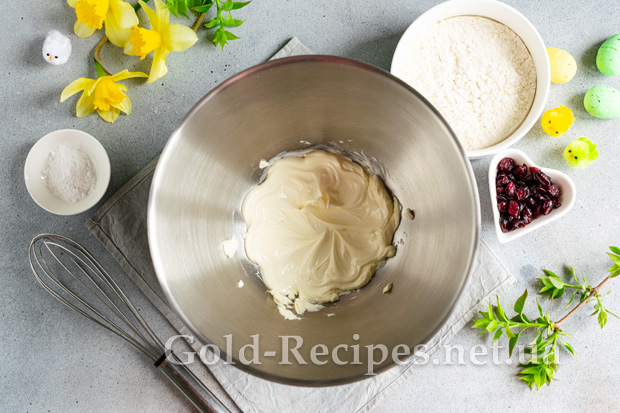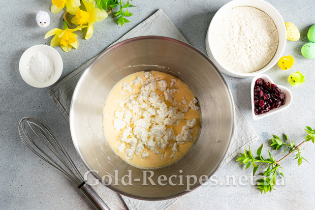 Сушену журавлину заливаємо окропом на 5 хвилин, обсушуємо від зайвої вологи паперовими серветками, додаємо в тісто.
