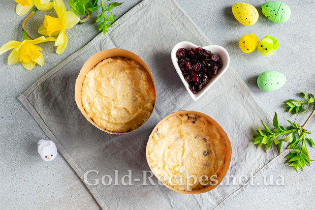 Знову перемішуємо інгредієнти, щоб журавлина рівномірно розподілилася серед тіста. Готове тісто викладаємо у формочки для приготування пасок, заповнюючи їх на 2/3. Якщо ви використовуєте металеві форми для пасок, попередньо змастіть їх олією. Силіконові або паперові форми для паски змащувати не потрібно.