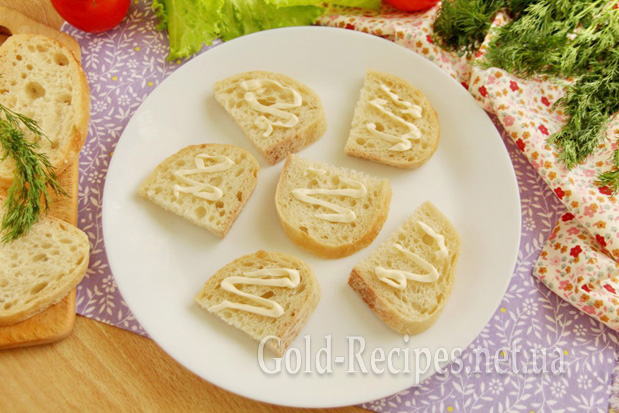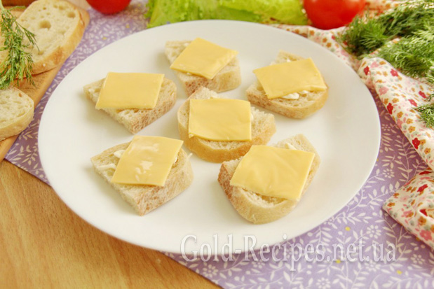 Тостовий сир ріжемо на квадратики, розмір яких порівняємо з розміром шматочків хліба. Викладаємо сир на хліб із майонезом.