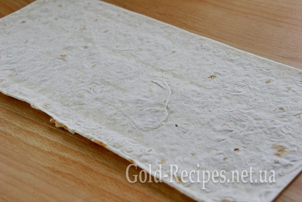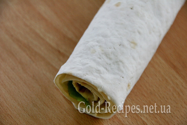 І ось він, найвідповідальніший момент – час згортати лаваш у трубочку, щоб вийшов рулет. Це треба зробити так, щоб цей самий рулет вийшов якомога щільнішим – тоді після нарізання він матиме акуратний вигляд і, як наслідок, апетитний.
