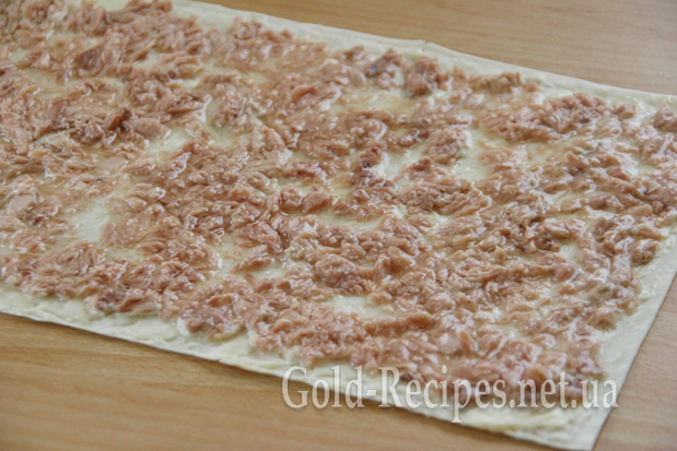Акуратно викладаємо шматочки консервованого тунця на лаваш, змащений майонезом. Намагайтеся при цьому, щоб разом із тунцем на лаваш потрапило якомога менше рідини.