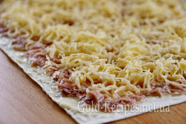Викладаємо сир на консервований тунець, розподіляючи його рівномірно по всій площі.