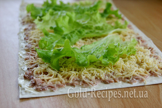 Доповнять наші рибні рулетики з лаваша, створюючи візуальний контраст, свіже листя салату і майонез.