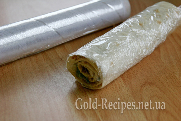 Загортаємо рулет у харчову плівку і відправляємо в холодильник на 2-3 години. Цього буде цілком достатньо, щоб лаваш як слід просочився начинкою.
