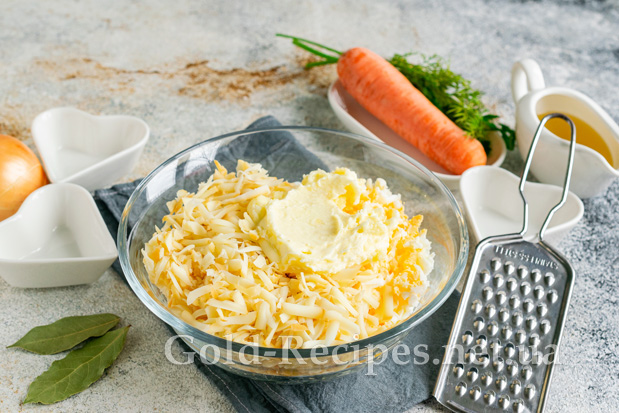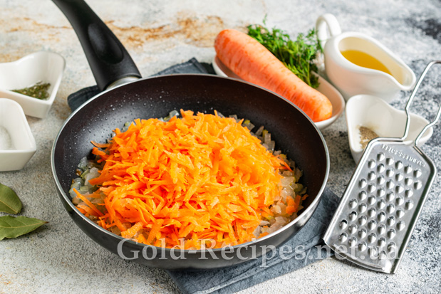 Моркву миємо, очищаємо від шкірки, подрібнюємо на тертці з великим полотном. Додаємо терту моркву до цибулі. Перемішуємо, продовжуємо обсмажувати інгредієнти разом на середньому вогні до м’якості овочів.
