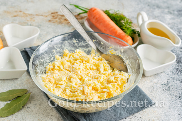 Тим часом готуємо начинку. Курячі яйця варимо круто, остуджуємо, очищаємо від шкаралупи, подрібнюємо на тертці з великим полотном. Копчену моцареллу тремо на великій тертці, перекладаємо до варених яєць. Додаємо в начинку розм’якшене вершкове масло, що залишилося.