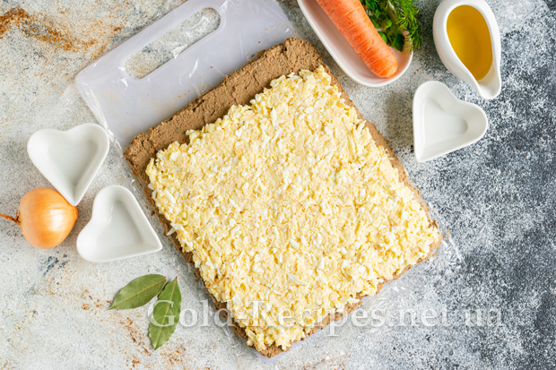 Рівномірно розподіляємо начинку з яєць і сиру поверх печінкового паштету, залишаючи один край вільним на 2 см.