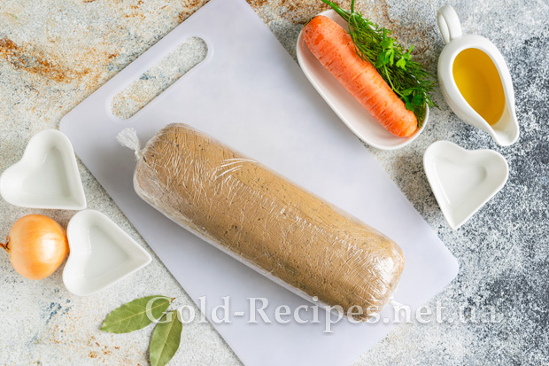 Обережно згортаємо заготовку в щільний рулет. Фіксуємо краї харчової плівки. Відправляємо рулет у холодильник на 1-2 години.