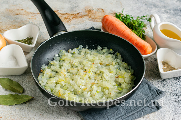 Цибулю очищаємо від лушпиння, нарізаємо дрібним кубиком. Викладаємо подрібнену цибулю на сковороду з розігрітою олією. Періодично помішуючи, пасеруємо цибулю на середньому вогні до легкого золотистого відтінку.