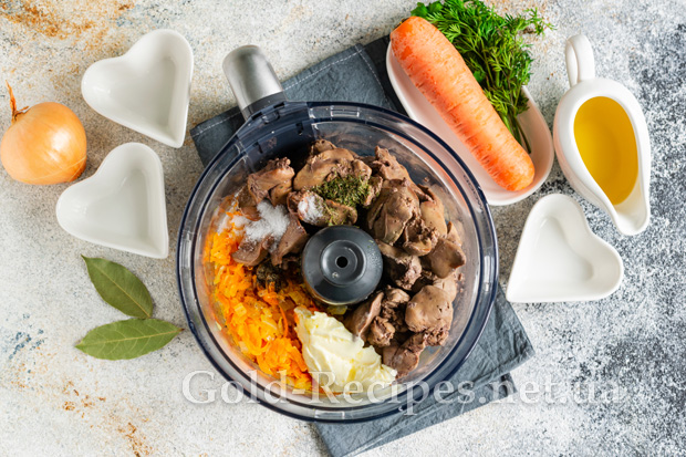 У чаші блендера з’єднуємо варену курячу печінку, пасеровані овочі, 20 г розм’якшеного вершкового масла, сіль і спеції за смаком.
