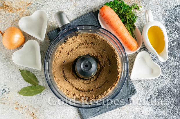Подрібнюємо інгредієнти в густий однорідний паштет. Також для цієї мети можна використовувати занурювальний блендер.