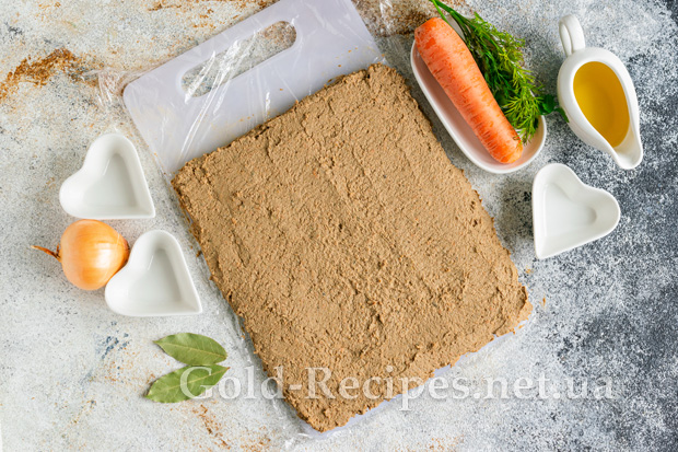 Обробну дошку застилаємо харчовою плівкою. Рівним шаром викладаємо паштет із курячої печінки з овочами. Відправляємо заготівлю до морозильної камери на 7-12 хвилин, щоб шар схопився і не продавлювався начинкою.