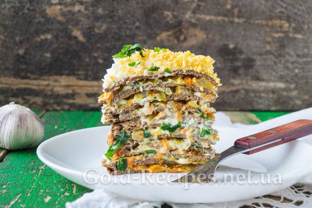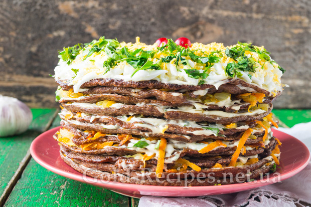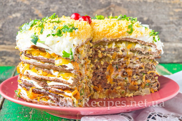 У поєднанні з овочами, часниковим соусом і спеціями печінка виходить настільки смачною, що цей торт сподобається навіть тим, хто не є шанувальником цих субпродуктів.