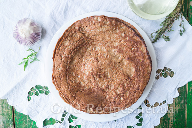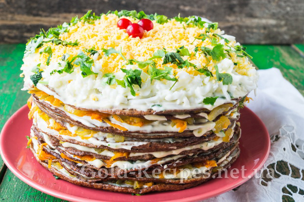 Чергуючи шари, зберемо торт. Верхній млинець змастимо майонезом із зеленню та часником.
