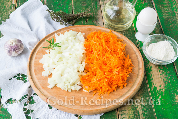Тепер приготуємо начинку. Ми будемо робити печінковий торт із цибулею та морквою. Тому подрібнимо овочі. Цибулю поріжемо кубиком, а моркву натремо.