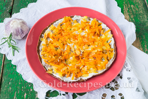 На плоску тарілку викладемо млинець. Змастимо його часниковим соусом. Зверху рівномірним шаром розподілимо начинку з цибулі та моркви.
