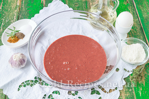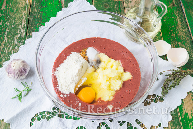 В отриману суміш вб’ємо яйце, додамо просіяне борошно, сіль і спеції.