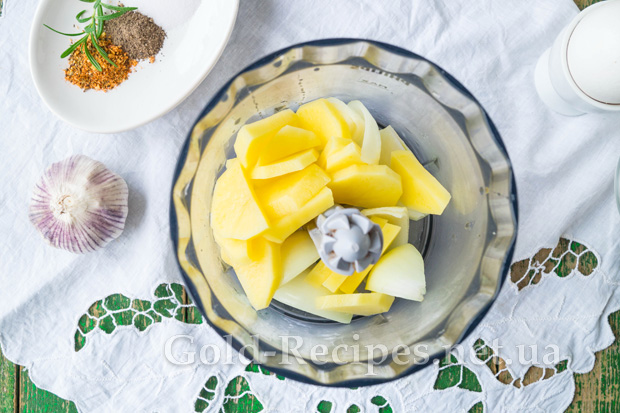 Одну цибулину почистимо та розріжемо на кілька частин. Картоплю помиємо, очистимо від шкірки та поріжемо на шматочки середньої величини. З’єднаємо цибулю та картоплю в чаші блендера.