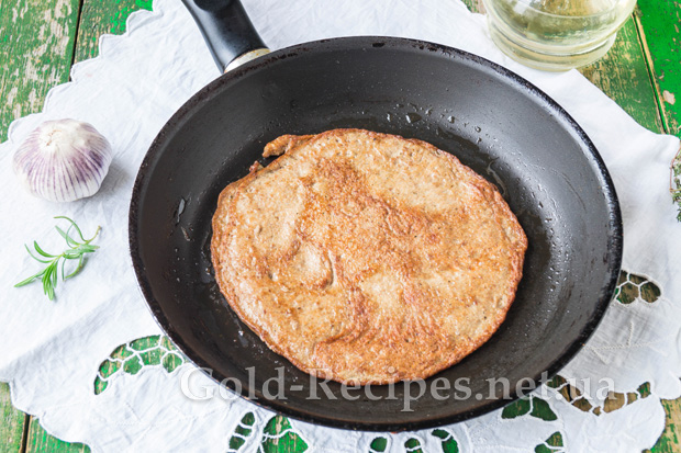 Обсмажимо печінковий млинець з одного боку й акуратно перевернемо на інший.