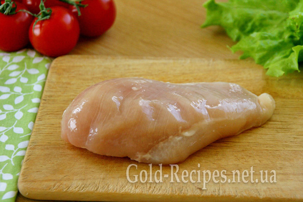 Курячу грудку вибираємо не надто маленьку – під час запікання вона зменшиться в розмірах, тому ліпше, якщо спочатку це буде велике філе. Миємо його, обсушуємо за допомогою паперового рушника.