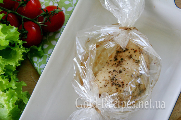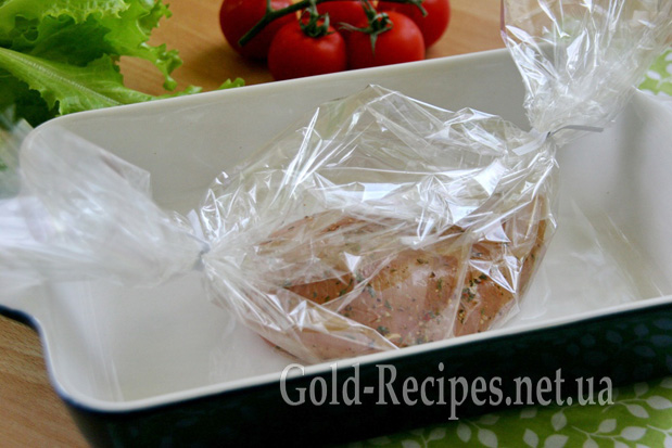 Після цього викладаємо філе в рукав для запікання. Кінці рукава щільно зав’язуємо. Викладаємо грудку в рукаві на деко або у форму і відправляємо в духовку, розігріту до 220 градусів.