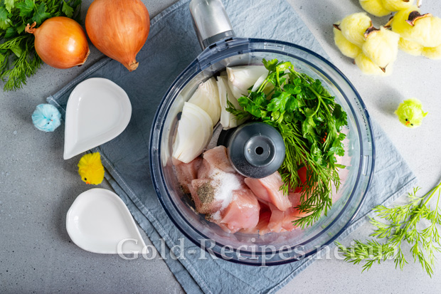 Тим часом готуємо начинку. Куряче філе миємо, обсушуємо від зайвої вологи, зачищаємо від жиру та плівочок. Розрізаємо м’ясо на невеликі шматочки, перекладаємо в чашу блендера.