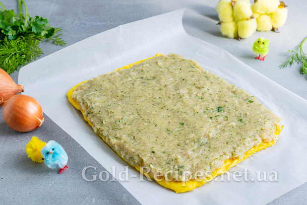 Рівномірно розподіляємо поверх сирного коржа начинку з курячого філе, залишаючи один край вільним на 2 см.