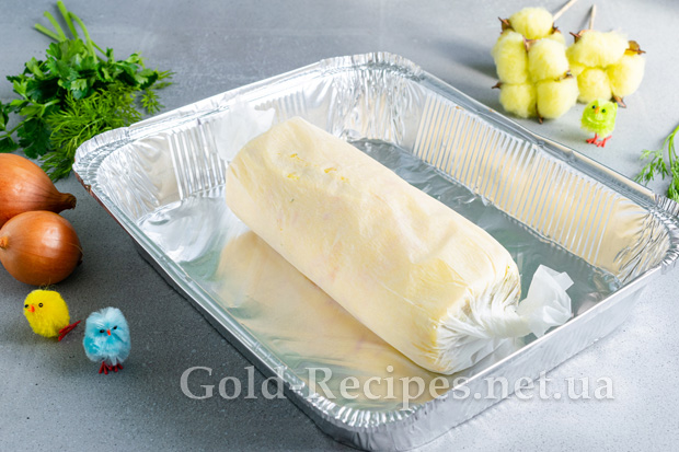 Загортаємо заготовку у щільний рулет, рухаючись до вільного краю. Загортаємо рулет у пергамент, як цукерку. Відправляємо закусочний рулет у розігріту до 180 градусів духовку на 40-45 хвилин.