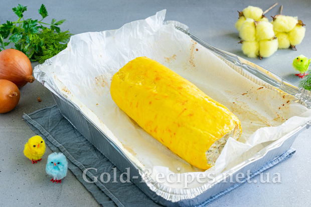 Готовий сирний рулет із начинкою з курячого філе акуратно дістаємо з духовки, знімаємо пергамент.