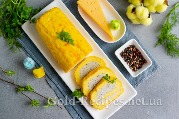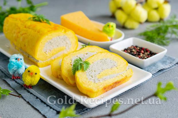 Закусочний рулет однаково смачний і в гарячому, і холодному вигляді. За бажанням в начинку можна додати обсмажені гриби або пасеровані овочі.