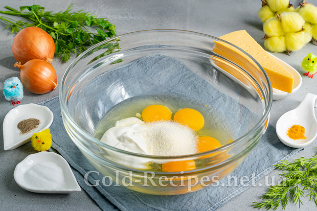 У глибокому посуді з’єднуємо курячі яйця, сметану та манну крупу.