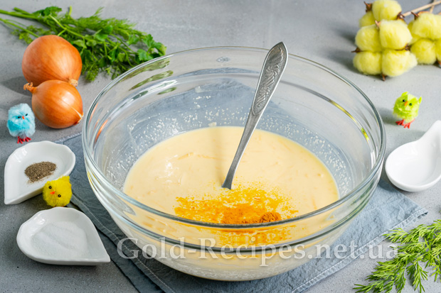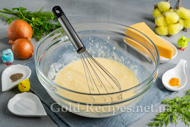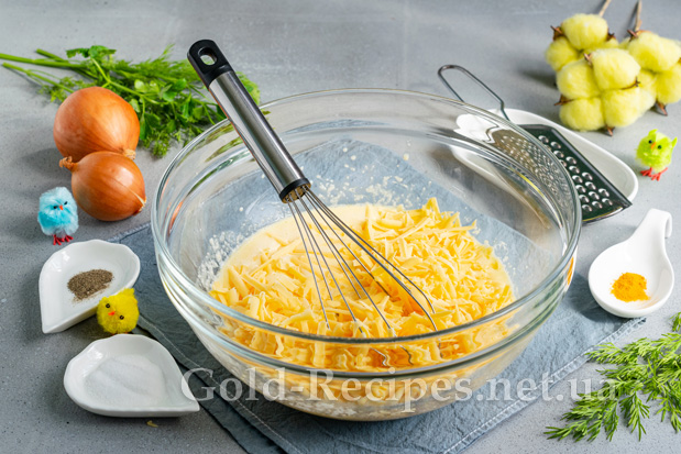 Твердий сир подрібнюємо на тертці з великим полотном, додаємо до яєчної суміші.