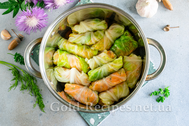Заливаємо овочеві голубці гарячим маринадом. Накриваємо закуску плоскою тарілкою та ставимо під гніт. З цією метою зручно використовувати скляну банку, наповнену водою. Остиглі до кімнатної температури голубці відправляємо маринуватися в холодильник на 24 години.