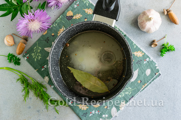 Готуємо маринад. В невеликій каструлі або ковші змішуємо воду, яблучний 6% оцет і рафіновану олію. Додаємо сіль, цукор, лавровий лист, зерна коріандру, бутончик гвоздики та горошини чорного запашного перцю. Постійно помішуючи, щоб сухі інгредієнти повністю розчинилися, доводимо маринад до кипіння.