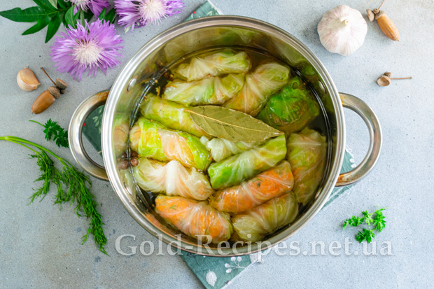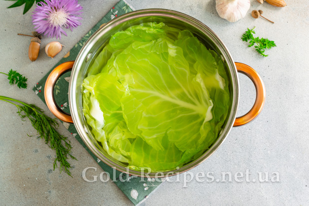 У глибоку каструлю наливаємо воду, доводимо до кипіння. Додаємо у воду дрібку солі, акуратно опускаємо в окріп листя капусти. Після повторного закипання води проварюємо капустяне листя протягом 3 хвилин. Потім дістаємо листя капусти з окропу за допомогою шумівки, перекладаємо в друшляк і охолоджуємо під струменем холодної води.